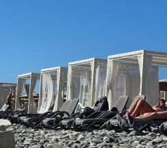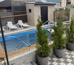 Приезжаем второй раз сюда, всё нравится: номера с балконом, холодильником и душевой; есть общие стиральные машины и места для глажки; а также бассейн с подогревом и мангальная зона.