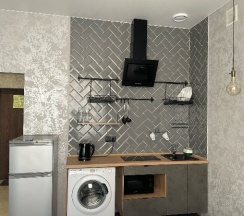 Номер оборудован техникой - это хорошо. Есть и плита, и холодильник, чайник, микроволновка, посуда. Стиральная машина, фен, утюг. Гладильная доска, сушилка. Телевизор с онлайн кинотеатром, wi-fi.