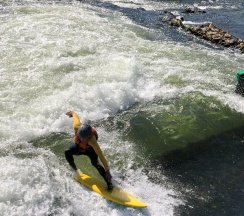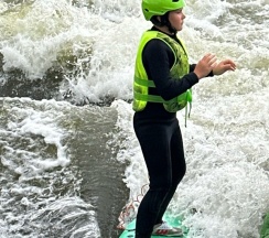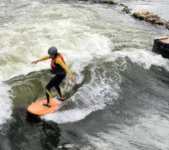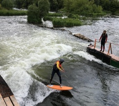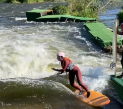 А после был серфинг!!! Это что-то невероятное, детский восторг и куча положительных эмоций. Перед уроком, мне выдали всё необходимое оборудование и рассказали ТБ, что заняло буквально 20 минут. После меня поставили на доску и под чутким руководством тренера я поехала!!! Мама, я - серфер))) Стоя на доске, ты будто летаешь. Это ни на что не похожие ощущения. Энергия реки восхищает, а волна завораживает. Хочется кататься на ней постоянно и совершенствоваться в искусстве серфига)