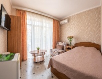 Стандарт на 2 этаже достаточно компактный, но в нем имеется всё необходимое: в первой комнате раскладывающийся диван в очень хорошем состоянии, журнальный столик, холодильник, чайник и посуда. Во второй комнате двуспальная кровать, ТВ, большой плательный шкаф, тумбочка.
