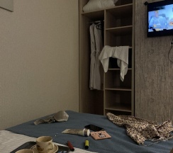 Номер чистый, всё необходимое для комфортного проживания было (полотенца, тапочки, шампунь...), удобные кровати, чистое не застиранное постельное бельё, много розеток, есть фен, ТВ, кондиционер,холодильник, чайник(вода, чай, кофе ежедневно пополняется) санузел в хорошем состоянии. Так же есть кухня где можно подогреть еду или попить чай.