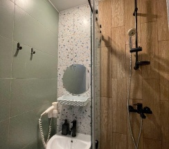 Номера небольшие, но уютные. Есть кухонька с плитой, можно поготовить при желании. В коридоре имеется стиралка - тоже плюс. Свежее постельное белье, но очень маленькие простыни, которые постоянно выбиваются. В целом, все понравилось. С бронью никаких накладок и проблем, оформляла прямо на сайте через тбанковский t-id. Читала в отзывах про духоту - ну не знаю, не заметила. А вот комары да, заели, даже фумигатор не спасал.((