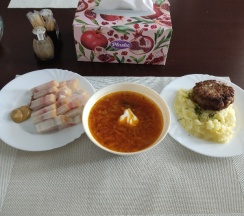 Оформились и решили тут же поужинать. Заказ принял тот же хороший человек на ресепшене, что и оформлял нас. Меню простое и понятно. Цены очень демократичные, а когда мы попробовали еду, то цены превратились в низкие). Приготовлено по домашнему вкусно, нормальные порции. Вареники самолепные очень вкусные. Котлеты рыбные (щучьи) самодельные вкуснейшие, в них рыба. Номера простые, чистые. Не накурено (прокурено), как бывает в часто бывает в придорожных отелях.