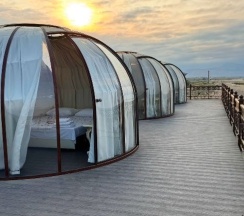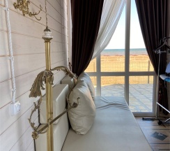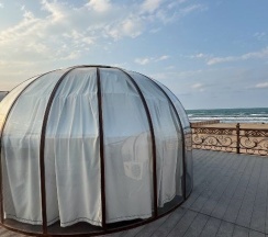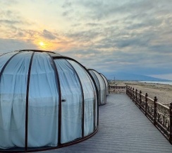 Купольный шатер с панорамными окнами с санузлом и кондиционером. Двухместное размещение на комфортном раскладном диване, белоснежное белье и гипоаллергенные постельные принадлежности. Потрясающий вид на море и пляж.