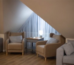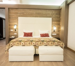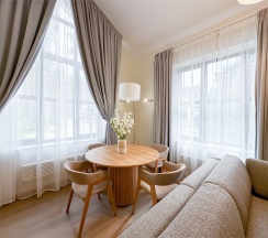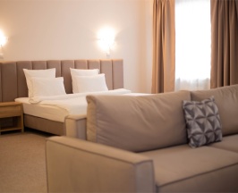 Номер категории «Джуниор сьют» — отличный выбор. Это однокомнатный номер с панорамными окнами и видом на сосновый бор. Он расположен на 2-м этаже здания СПА-комплекса.