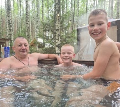 Вежливые администраторы и понимающие ( мы заказывали в день заезда на 17 часов баню и чан , но дорога у нас заня слишком много времени, мы позвонили администратору и она быстро решила нашу проблему !) приехали мы только около 7 вечера , было бы обидно если бы не успели сходить в чан , но все подготовили к нашему приезду ) Много всего интересного для отдыха с детьми и кино вечера и бассейн и площадка , можно покидать мяч или поиграть в футбол , контактный зоопарк !) мы уже планируем поезду на следующий Год семьями )