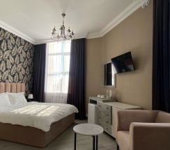 Комфортный и современный номер улучшенной планировки. Площадь номеров: 30 и 35 кв.м. В номере одна большая двуспальная кровать, раскладной диван, прикроватные тумбы, торшер, телевизор с плоским экраном, кондиционер, удобные кресла, туалетный столик, чайник и чайные принадлежности, кондиционер, телевизор с плоским экраном и Smart TV, мини-бар, холодильник, телефон, установлен бесплатный электронный сейф, шкаф. Комплимент от отеля - чай, кофе, вода, сахар в номере.