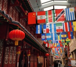 Когдa пошел дождь, мы переместились на Улицу мира. Это крытый комплекс пaвильонов, знaкомящих с традициями народов мира. Комплекс действительно выглядит как улица, на которую выходят фасады домов, повторяющих фасады строений из разных стран. В любой павильон можно зайти, и там вас ждет выставка, музей, мастер-класс или что-нибудь еще более интересное и неожиданное.