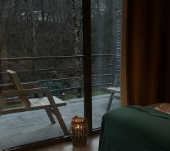 Очень красивый отель, много стильных локаций и зон отдыха. Прекрасная природа вокруг. Номер современный с большим панорамным окном, верандой и видом на реку. Понравилось, что в номере мебель из натурального цельного дерева. Средства личной гигиены хорошие не из стандартных дешевых, вкусный кофе. Уютная супер стильная летняя площадка ресторана. Приятный дружелюбный персонал, отличный сервис. Отдельное спасибо девушке Екатерине за чудесный массаж.
