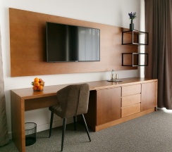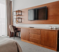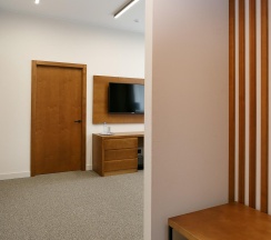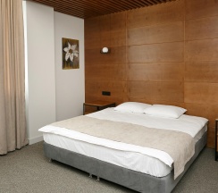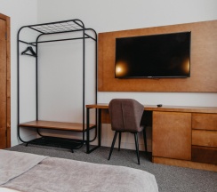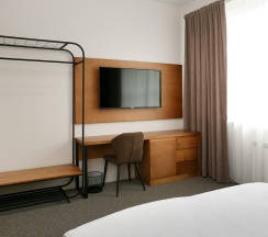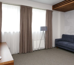 Просторный светлый номер с двумя комнатами. В одной из комнат установлен диван-кровать, который с легкостью трансформируется в спальное место. Во второй комнате находится кровать с ортопедическим матрасом. В каждой комнате есть письменный стол, телевизор. В номере установлен мини-холодильник. Санузел оснащен душевой кабиной.