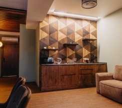 Номер расположен на последнем этаже гостиничного комплекса. Из панорамных окон открывается шикарный вид на Бобровый лог и природу заповедника Столбы. Просторная прихожая, зал-студия совмещенная с зоной кухни и уютная спальня. Номер оснащен всем необходимым для длительного проживания: посуда, чайник, микроволновка, мини-холодильник. В номере установлен диван-кровать, который с легкостью трансформируется в спальное место для двоих гостей. В спальне установлена большая кровать с ортопедическим матрасом для вашего комфортного отдыха. В санузле душ, набор гигиенический принадлежностей, халат, тапочки, набор полотенец, фен.