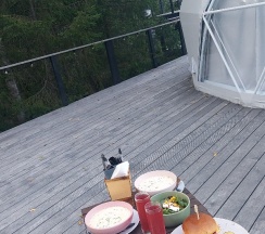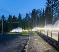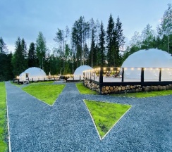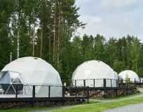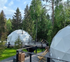 Прекрасное место для отдыха! Мы выбрали купол и нам очень понравилось))) очень уютно, чисто, все новое. Ещё брали чан-это прям обязательно, не пожалеете (единственное я бы посоветовала персоналу в воду добавлять кружочки апельсинок, веточки мяты). Прекрасные завтраки входят в стоимость аренды. Обед и ужин можно заказать по меню-очень вкусно! А вот напитки необходимо брать с собой, на территории комплекса в продаже только морс и квас. В домиках есть чайник, кофе, чай, сахар, штопор, посуда, фужеры, стаканы. У каждого домика мангал. Можно покататься на садах, каяках, лодках.