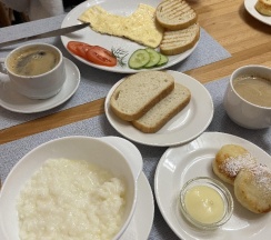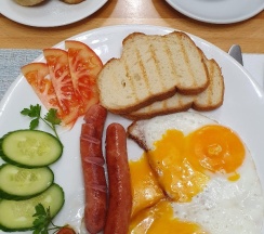 Завтраки сытные, вкусные. Можно выбрать, так же можно и пообедать в кафе.