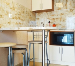 Кухня оснащена обеденным столом + 4 посадочных места, необходимым набором посуды, а также стиральной машинкой и холодильником.