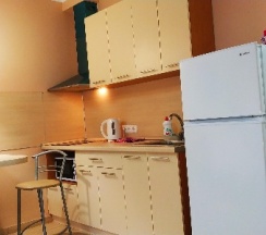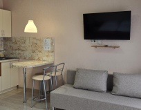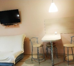 Очень душевная студия. Удобная кровать,шторы тёмные,выспаслась отлично. Для длительного проживания отлично подойдёт. В кухонном уголке есть всё необходимое для приготовления пищи,большой холодильник. Есть мокроволновка,стиральная машина,утюг,доска гладильная,телевизор смарт тв,отличное освещение комнаты. Супер!!!