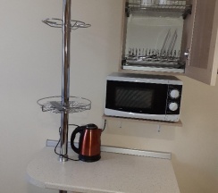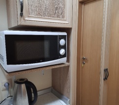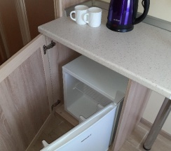 В номере есть мини холодильник, микроволновка и чайник. Есть тапочки 🤌🏼 и разовый шампунь/гель.