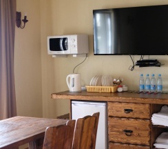 Столовая группа на 4-ых, WI-FI, ТВ, холодильник, микроволновка, электрический чайник, набор посуды, чай, кофе, вода, сахар, сан.узел (душ, туалет), изолированная спальная комната, 4 спальных места, туалетные расходники, собственная терраса и мангал.