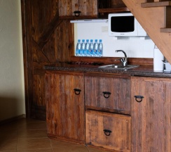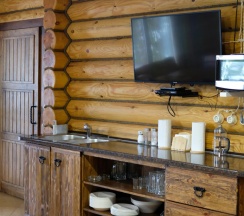 В каждом доме есть набор посуды по количеству проживающих, небольшой холодильник, микроволновая печь, электрочайник, а также чай-кофе для гостей. У каждого дома собственная крытая терраса со столом и лавками для комфортного отдыха на природе, рядом с домом - индивидуальная мангальная зона с решеткой. Также на территории имеются беседки различной вместимости доступные для аренды, детская игровая площадка, спортивная площадка с песчаным покрытием для игры в волейбол.