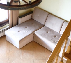 Сауна, столовая группа на 15 человек, WI-FI, ТВ, холодильник, микроволновка, электрический чайник, набор посуды, чай, кофе, вода, сахар, 1 сан.узел, 3 спальные комнаты, 8 спальных мест, постельное белье, туалетные расходники, своя терраса с мангалом.