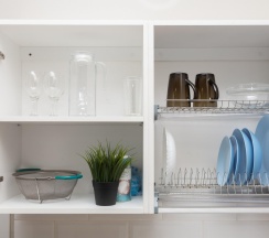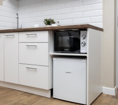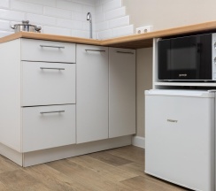 - Холодильник, микроволновка, чайник, плита и полный набор посуды.