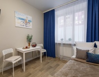 Комната уютная, все необходимое есть. Места хватает для комфортного проживания вдвоем. Апартаменты располагаются недалеко от центра города, рядом есть магазины.