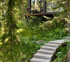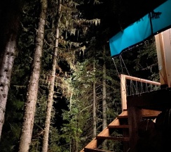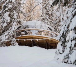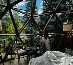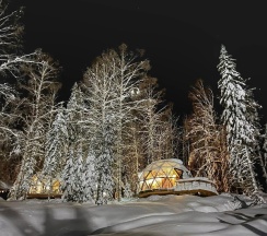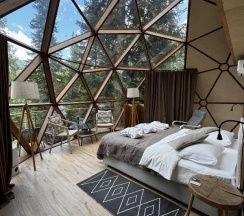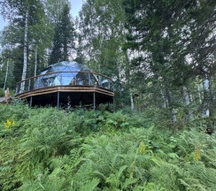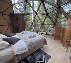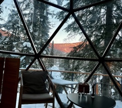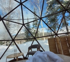 Давно хотела пожить в купольном домике, поэтому выбор сразу пал на иглу.. Романтическая обстановка. Обалденный запах леса, особенно после дождя. При бронировании учли мое пожелание, чтобы вид был на лес. В целом там у всех иглу вид на лес, но есть парочка первых, которые выходят на стройку и склад кресельных подъёмников . Внутри иглу все красиво, со вкусом. Удобная кровать, хорошее постельное белье, халаты, тапочки. Температуру внутри можно регулировать. Посуды немного, но для проживания 1-2 дня хватает. Холодильник маленький, частично занят продукцией мини-бара.