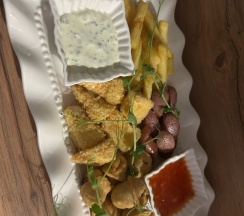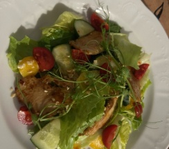 В фото прикрепляю пару блюд из меню - пивная тарелка и салат с курицей и персиком.