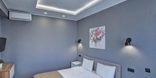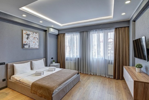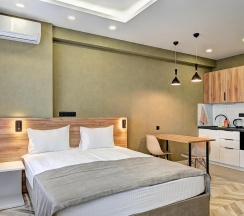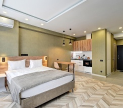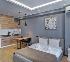 Современные и уютные апартаменты-студио GR с двуспальной кроватью, рассчитаны на двух гостей. Площадь 30 кв.м. В номере двуспальная кровать размером 160 на 2м. Апартаменты оборудованы смарт ТВ с плоским экраном, кондиционером. В зимнее время года отапливается собственной котельной. В апартаментах есть небольшой балкончик. Наши гости могут приготовить вкусный завтрак, обед или ужин, для этого есть все необходимые кухонные принадлежности и техника (электрическая варочная панель, микроволновка, холодильник).