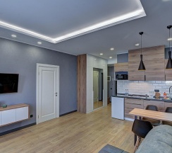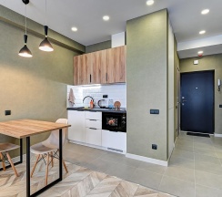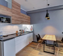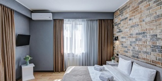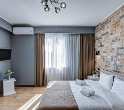 Современные и уютные апартаменты-студио с двуспальной кроватью оформленные в стиле лофт, рассчитаны на двух гостей. Площадь 30 кв.м.