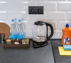В комнате есть платяной шкаф, гладильная доска, утюг, сушилка для белья, полотенца, халаты, тапочки, чай, кофе, сахар, бутилированная вода 0,5 на человека в сутки, фен, стиральная машина, шампунь, мыло, гель для душа, капсула для стирки, средство для мытья посуды.