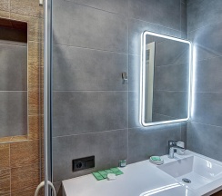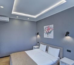 Апартаменты улучшенные GR, вместимость 4 человека, 50 кв.м. Одна двуспальная кровать размером 160 см на 2м, один раскладной диван с независимым пружинным блоком, размером 160 см на 2м. Номер оборудован Смарт ТВ с плоским экраном (2 шт), кондиционером (2 шт). В зимнее время года отапливается собственной котельной. В номере есть 2 небольших балкончика. Так же номер оборудован полноценной кухней, со всей необходимой техникой, кухонными приборами и принадлежностями для приготовления еды. На кухне есть электрическая варочная панель, микроволновка, холодильник. В комнате есть платяной шкаф, гладильная доска, утюг, сушилка для белья, полотенца, халаты, тапочки, чай, кофе, сахар, бутилированная вода 0,5 на человека в сутки, фен, стиральная машина, шампунь, мыло, гель для душа, капсула для стирки, средство для мытья посуды.