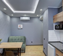 Апартаменты-студио «Комфорт» GR, вместимость 3 человека, 38 кв.м. Одна двуспальная кровать размером 160 см на 2м, один раскладной диван с независимым пружинным блоком размером 125 см на 2м. Номер оборудован Смарт ТВ с плоским экраном (2 шт), кондиционером. В зимнее время года отапливается собственной котельной. В номере есть 2 небольших балкончика. Так же номер оборудован полноценной кухней, со всей необходимой техникой, кухонными приборами и принадлежностями для приготовления еды. На кухне есть электрическая варочная панель, микроволновка, холодильник. В комнате есть платяной шкаф, гладильная доска, утюг, сушилка для белья, полотенца, халаты, тапочки, чай, кофе, сахар, бутилированная вода 0,5 на человека в сутки, фен, стиральная машина, шампунь, мыло, гель для душа, капсула для стирки, средство для мытья посуды.