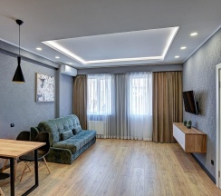 Современные, уютные апартаменты с отдельной спальней, оформленные в стиле лофт с одной двуспальной кроватью размером 160 см и одним раскладным диваном с независимым пружинным блоком, размером 160 см. Площадь 50 кв. м.