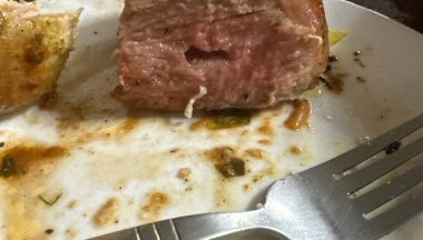 Очень мягкое, сочное, в меру жирное мясо, даже полежав в холодильнике сутки после того, как мы его разогрели в микроволновке оно было очень нежным и вкусным.