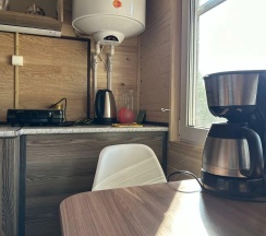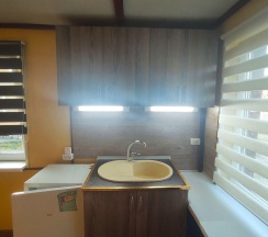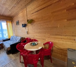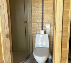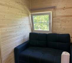 Одноэтажный домик для 1-2 человек: кухонная зона, санузел, комната. В комнате есть диван-кровать, холодильник, столик, теплые полы, микроволновка, телевизор.