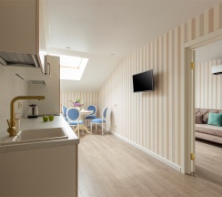 Двухкомнатный люкс с панорамным остеклением, который включает в себя: изолированную спальню с кроватью размера king size, гостиную с двуспальным диваном, кухню с полноценным оборудованием и просторную ванную комнату.