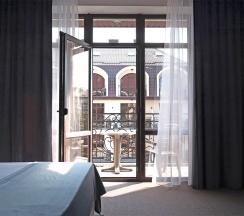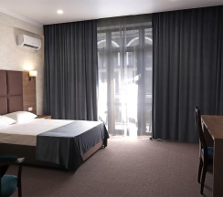 Номер люкс с изысканным интерьером для размещения одного или двух человек. Площадь номера 28 м2. Возможна установка одного дополнительного места. В комнате одна большая кровать размера king-size с мягким изголовьем и ортопедическим матрасом, прикроватные тумбочки, письменный стол, кофемашина, чайник и набор посуды, стулья, мини-холодильник, телефон, телевизор, шкаф-купе. В ванной комнате: халаты, тапочки, фен, душевая кабина, бесплатные гигиенические принадлежности: мыло, шампунь, гель для душа, комплект полотенец. Номер оборудован кондиционером. Бесплатный Wi-Fi и цифровое телевидение в номере. Номер расположен на первом этаже. Из номера имеется отдельный выход во внутренний двор – патио.