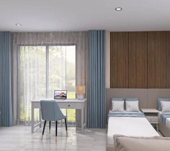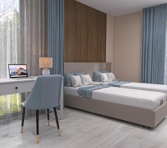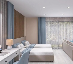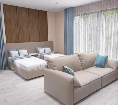 В номере: 2 кровати (90 x 210), угловой 2-спальный диван, 2 прикроватных тумбочки, балкон, шкаф, банные комплекты из трех полотенец, минибар, банные халаты из «вафельного хлопка», телевизор, кондиционер, щётка для одежды, салфетка для обуви, рожок обувнойтелефон, чайная группа, журнальный столик, одноразовые тапочки, багажница с вешалкой.
