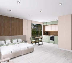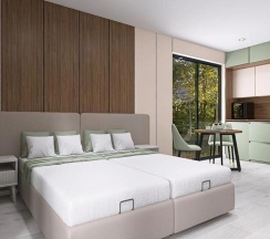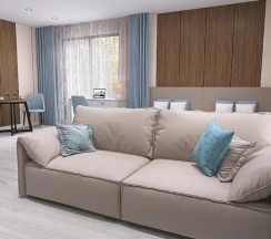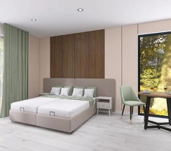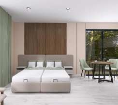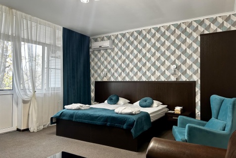 В номере: 1 кровать 160 x 210, угловой 2-спальный диван, 2 прикроватных тумбочки, балкон, шкаф, банные комплекты из трех полотенец, минибар, банные халаты из «вафельного хлопка», телевизор, кондиционер, щётка для одежды, салфетка для обуви, рожок обувнойтелефон, чайная группа, багажница с вешалкой, одноразовые тапочки.
