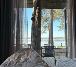 Очень уютное , тихое место. Домики оснащены всем необходимым , в холодное время года мерзнуть не придется , так как полы с подогревом . С окна открывается вид на озеро , можно посидеть на террасе и полюбоваться природой ☺️