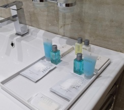 Есть все принадлежности для душа, плотные фирменные тапочки, питевая вода, чай и кофе, туалетная бумага (на вторые сутки всё пополнили, кроме бутылочек воды).