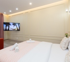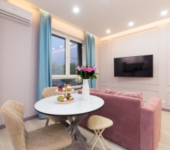 Отдыхала в этих чудесных апартаментах 2 ночи в июне 2025 года. Впечатления только положительные: красивое оформление в стиле прованс с оттенками розового; полноценная кухня со всем необходимым, стиральная и посудомоечная машинки, вся необходимая бытовая химия, полотенца и губки. Душ-туалет удобные, чистые и красивые. Вообще чистота радует. Кровать для меня оказалась очень удобной, просто отлично!