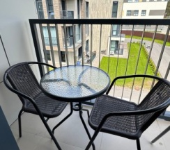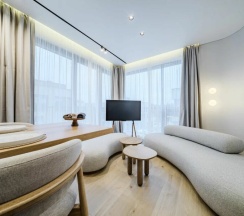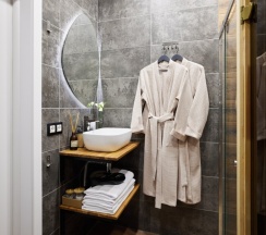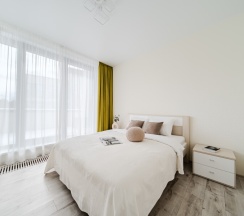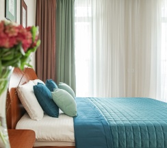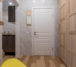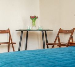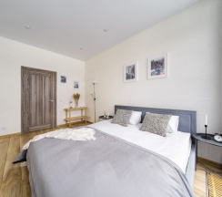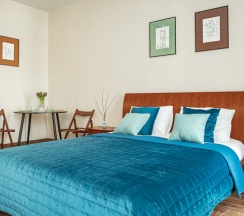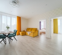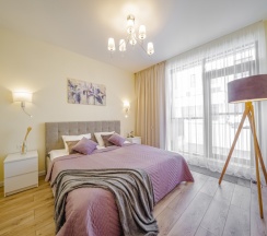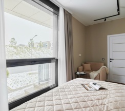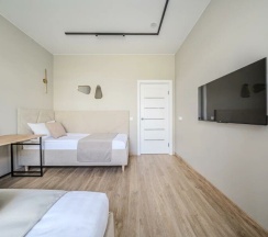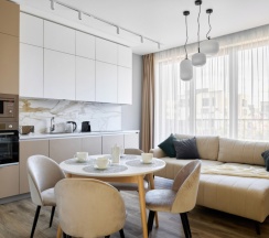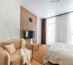 К вашим услугам уютная спальня с большой кроватью king-size, просторная кухня-гостиная с диваном (не раскладывается), совмещенный санузел, терраса с удобным местом для отдыха. Окна апартаментов и балкон – с видом на внутренний двор.