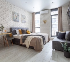 К вашим услугам студия, совмещенный санузел, балкон с удобным местом для отдыха. Окна апартаментов и балкон – с видом во двор.