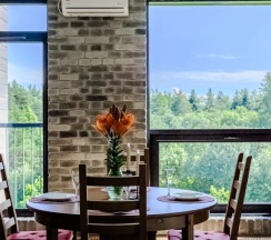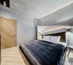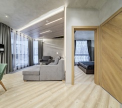 К вашим услугам уютная спальня, просторная кухня-гостиная, совмещенный санузел, гардеробная, балкон с удобным местом для отдыха. Окна апартаментов и балкон – с видом на шале.