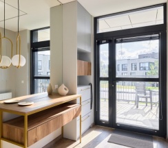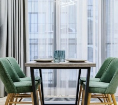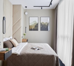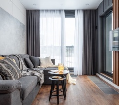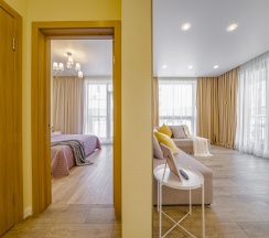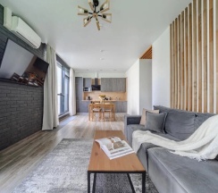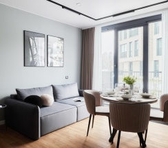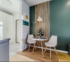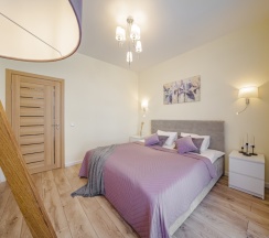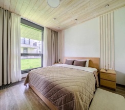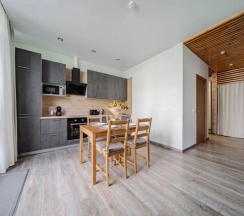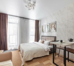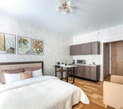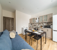 К вашим услугам уютная спальня, просторная кухня-гостиная, совмещенный санузел, терраса с удобным местом для отдыха. Окна апартаментов – с видом на зеленый двор.
