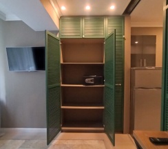 Номера украшает большой вместительный зеркальный шкаф, в котором находится сейф и отделение для чемоданов. Он расположен рядом с кроватью и в дверцах отражается расположенное напротив окно, что делает номер милее и светлее.