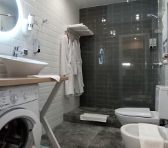 Уютные и тихие номера в стиле нео-классика со всеми удобствами – стиральной и посудомоечной машинами, эргономичным кухонным и столовым уголками, зоной отдыха с удобным креслом или диваном, кондиционером и смарт телевизорами.