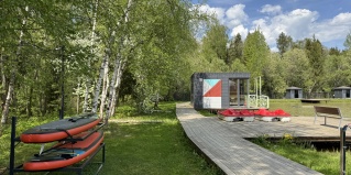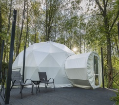 Купол, расположенный в окружении леса у благоустроенного водоема, имеет или свою террасу, или же индивидуальную лужайку для отдыха с гамаком и мангальной зоной.