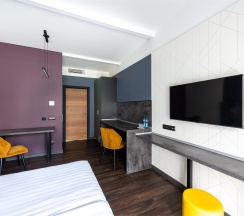 Однокомнатный номер площадью 24-27 кв.м. отличается функциональной рабочей зоной в спальне и имеет выход на индивидуальную террасу с зоной барбекю.